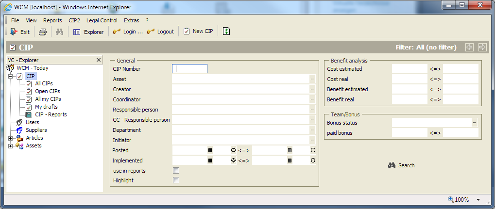 Neben einer "globalen Suche" über das Fernglas in der Toolbar der Applikation hat der Benutzer die Möglichkeit in einer detaillierten Suchmaske nach ganz bestimmten Kriterien von KVP-Themen oder Vorschlägen zu suchen.