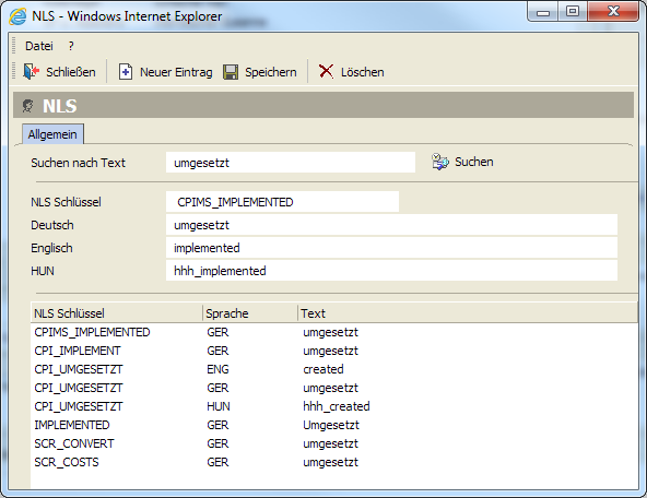 Ein Anwendungsadministrator in Ihrem eigenen Unternehmen hat jedoch die Möglichkeit "sämtliche" Texte, Beschriftungen, Meldungsfenster, Überschriften, etc. einfach alle Texte in der Applikation direkt in einer Eingabemaske selbst zu modifizieren. Damit kann die gesamte Applikation in jede gewünschte Sprache (die von links nach rechts geschrieben wird) übersetzt werden. Kyrillische oder andere nationale Zeichen stellen dabei kein Problem dar.
