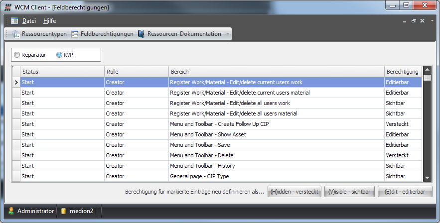 Wie bereits an anderer Stelle erwähnt, besteht die Möglichkeit, nicht verwendete Informationen und Programmbereiche vollständig auszublenden, sowie die Bearbeitungsmöglichkeiten einzelner Informationen in Abhängigkeit der Rolle des angemeldeten Benutzers bei einem bestimmten KVP-Thema einzuschränken.
